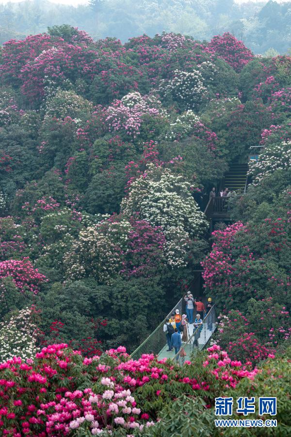 3月19日,在百里杜鹃管理区金坡景区,游客在索玛花桥上赏花拍照。新华社发(李华 摄)
