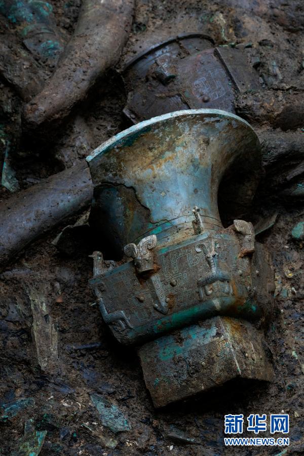 这是在三星堆遗址考古发掘现场3号“祭祀坑”内拍摄的青铜器和象牙(3月16日摄)。