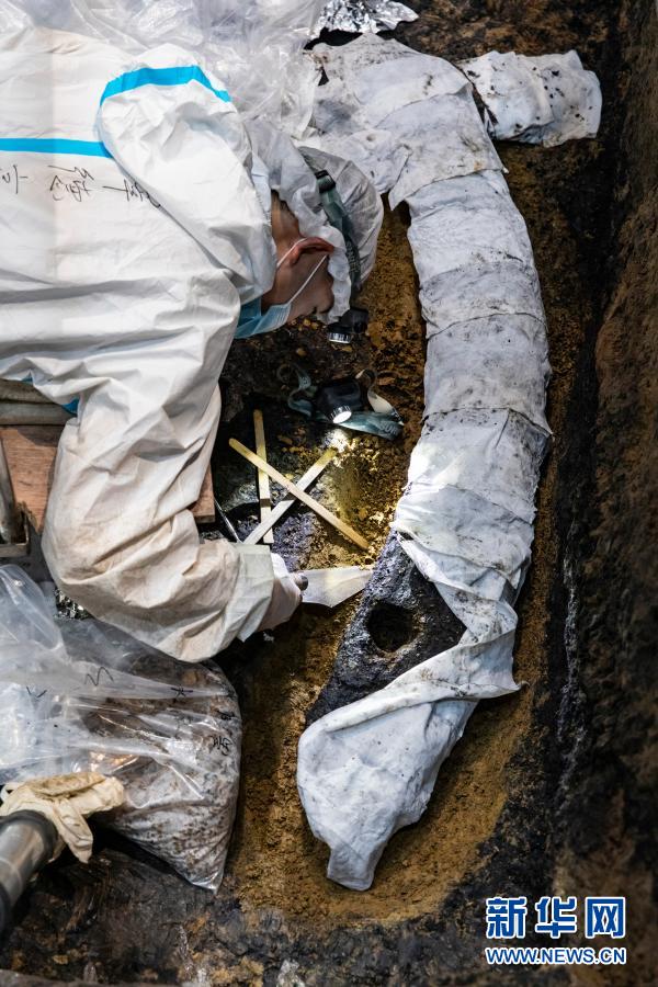 在三星堆遗址考古发掘现场,考古人员在4号“祭祀坑”内清理象牙(3月17日摄)。