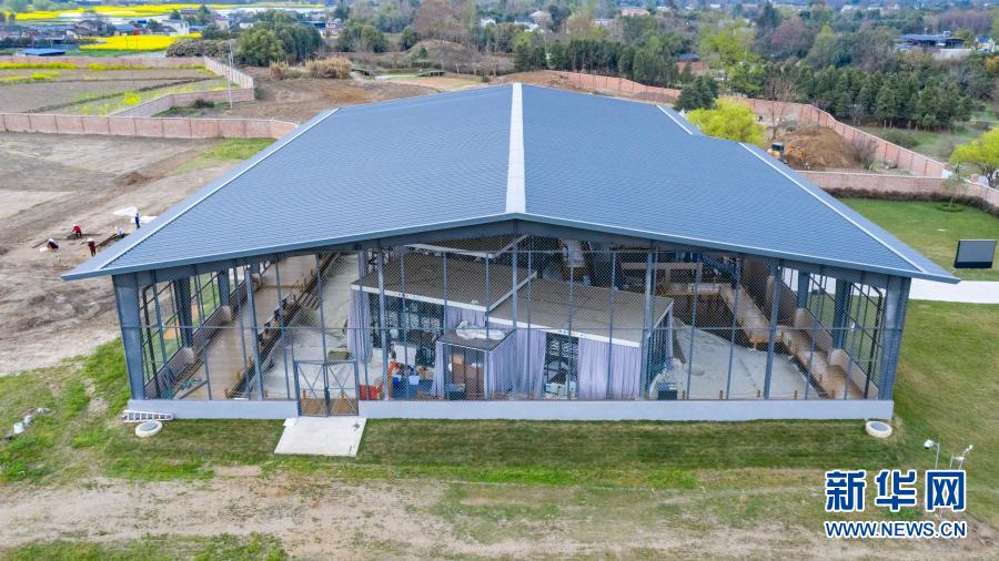三星堆遗址考古发掘现场的保护大棚以及其内的工作舱(3月1日摄,无人机照片)。