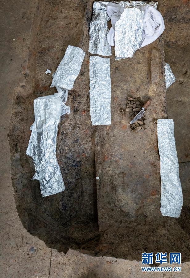 画面右侧为三星堆遗址考古发掘现场6号“祭祀坑”内“木匣”所在的区域(3月1日摄)。考古人员在6号“祭祀坑”发现的这具“木匣”长约1.5米、宽约0.4米。