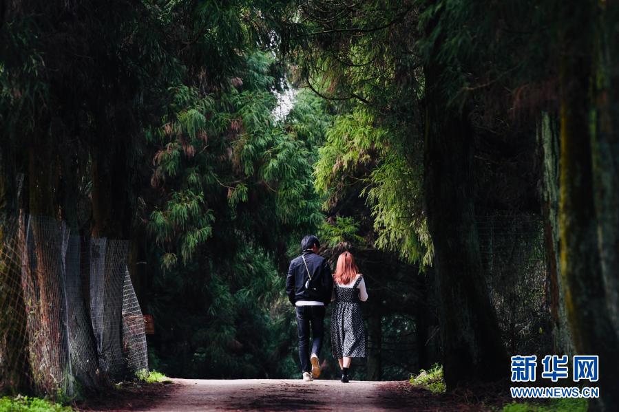 3月9日,一对情侣行走在福州鼓山一条山路上。