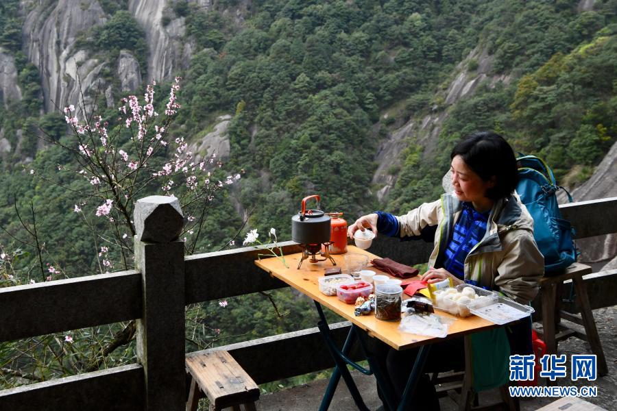 3月9日,一名登山的市民在福州鼓山白云洞景点旁泡茶歇脚。