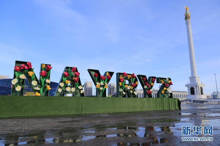 这是3月19日在哈萨克斯坦努尔苏丹独立广场拍摄的庆祝纳乌鲁斯节的装饰。