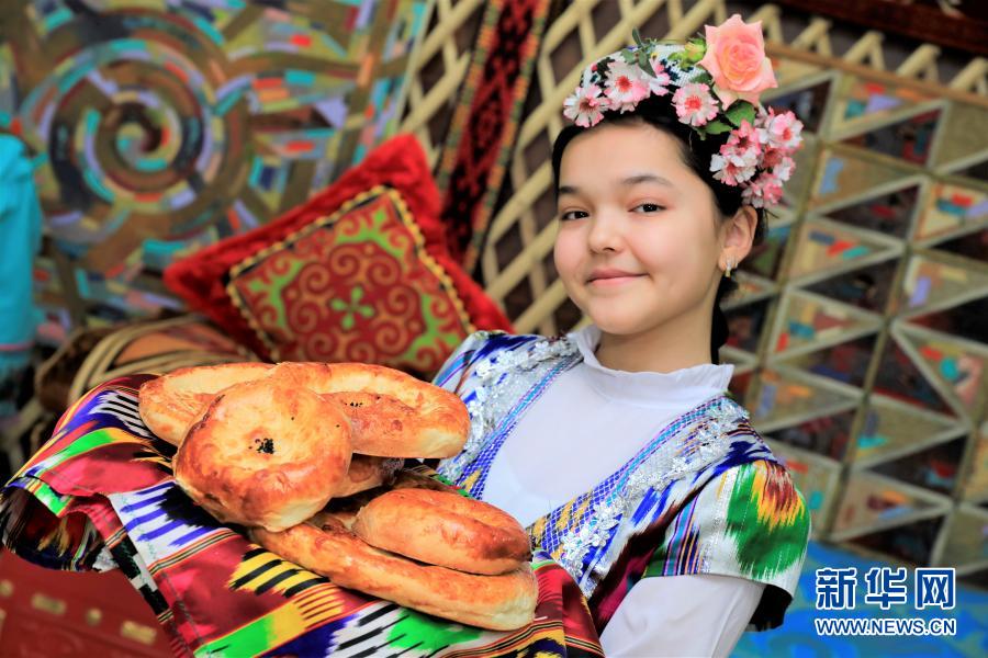 3月19日,一名身着民族服饰的哈萨克斯坦女孩在努尔苏丹展示传统美食,庆祝即将到来的纳乌鲁斯节。
