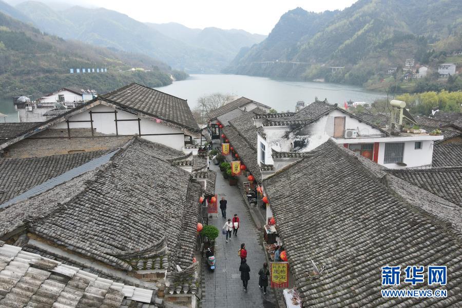 游客在石泉县后柳古镇游览(3月19日摄,无人机照片)。新华社记者 邵瑞 摄