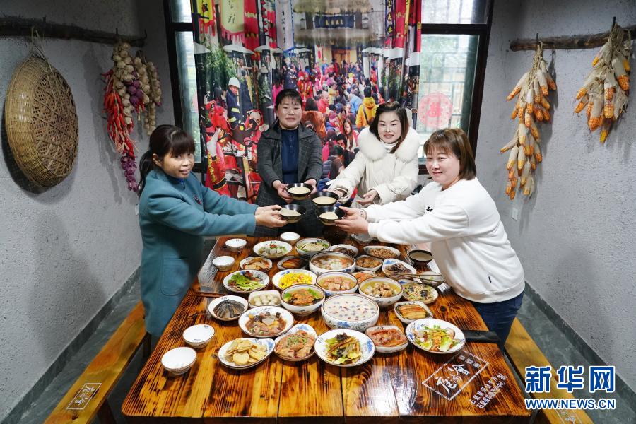3月19日,在石泉县中坝作坊小镇内,游客与当地美食模型合影。新华社记者 邵瑞 摄