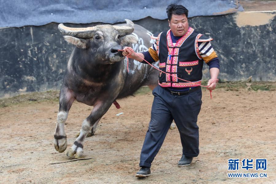 3月20日,苗族同胞在丹寨万达小镇内进行斗牛活动。新华社记者 欧东衢 摄