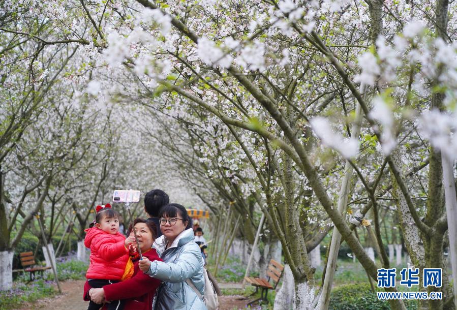 3月20日,游人在江西省南昌县凤凰沟景区樱花谷拍照留念。