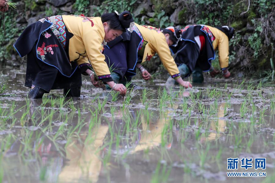 3月20日,苗族同胞在丹寨县龙泉镇卡拉村的梯田内插秧。新华社记者 欧东衢 摄