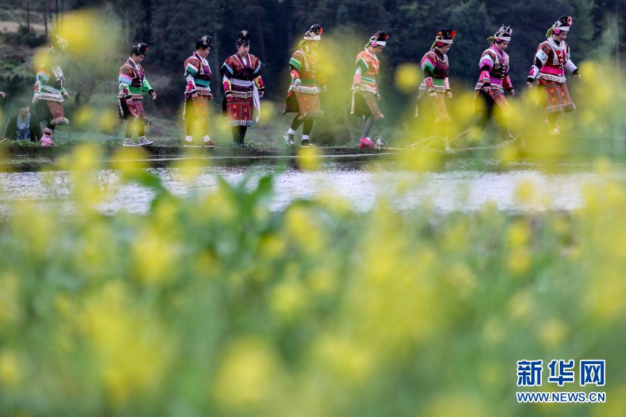 3月20日,苗族同胞身着盛装在丹寨县龙泉镇卡拉村田埂上参加“春耕大典”。新华社记者 欧东衢 摄