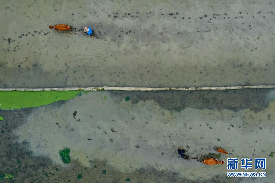 3月20日,苗族同胞在丹寨县龙泉镇卡拉村的梯田里耕作(无人机照片)。新华社记者 欧东衢 摄