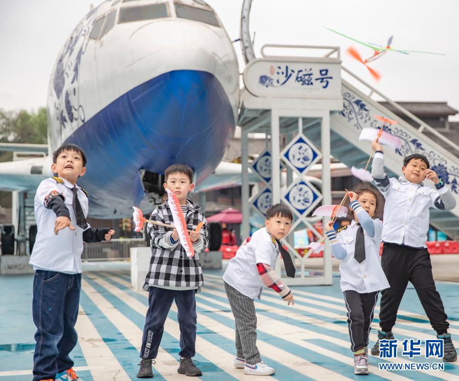 3月20日,在重庆市沙坪坝区磁器口一家航空飞行体验馆,小朋友在放飞自己动手制作的橡筋动力模型飞机。新华社记者 黄伟 摄