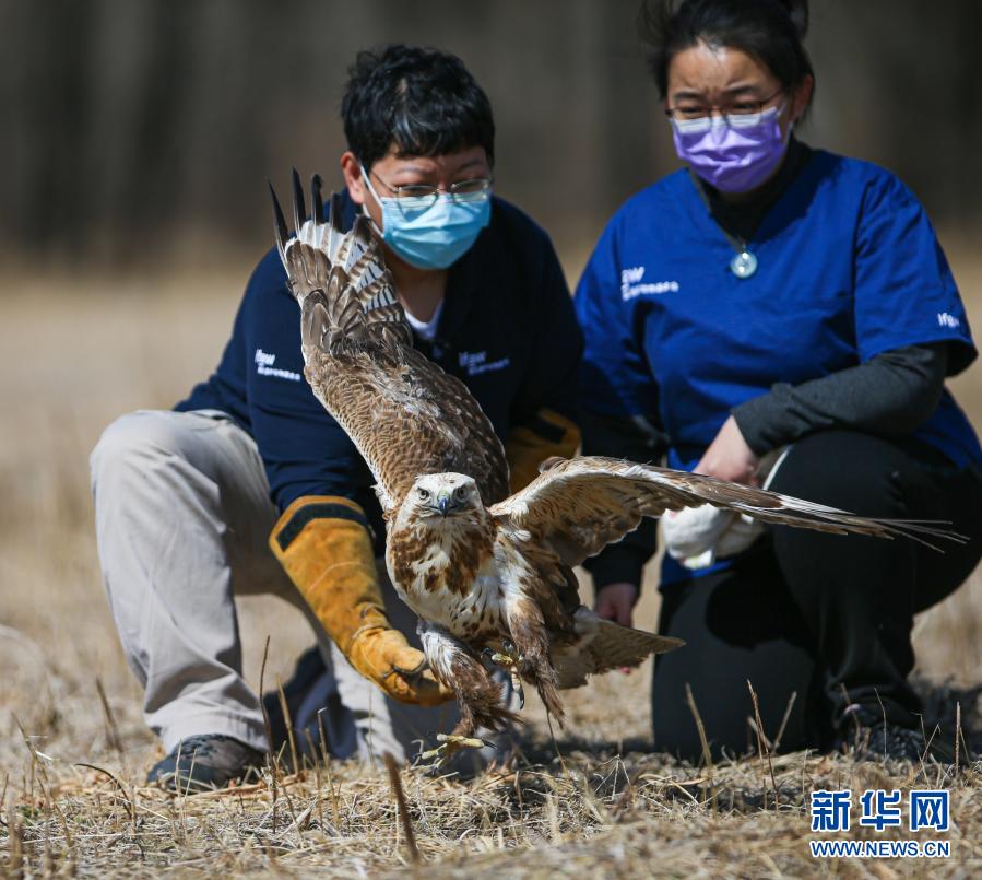 3月20日,北京猛禽救助中心猛禽康复师戴畅(右)和周蕾放飞大鵟。新华社记者 李京 摄