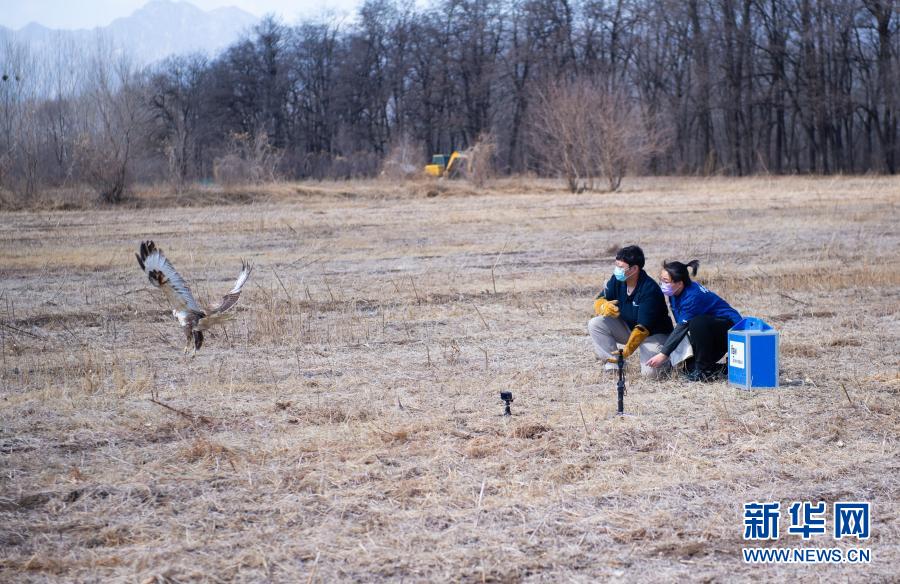3月20日,北京猛禽救助中心猛禽康复师戴畅(右)和周蕾放飞大鵟。新华社记者 陈钟昊 摄