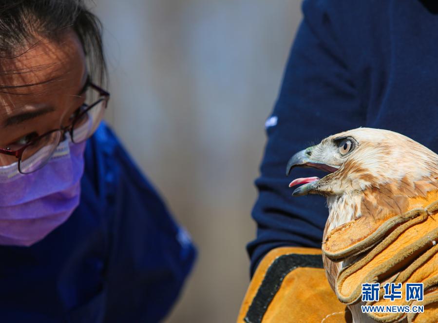 3月20日,北京猛禽救助中心猛禽康复师戴畅在放飞大鵟前进行最后的检查。新华社记者 李京 摄
