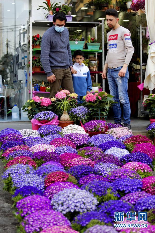 3月20日,在黎巴嫩首都贝鲁特,人们在花店购买鲜花。