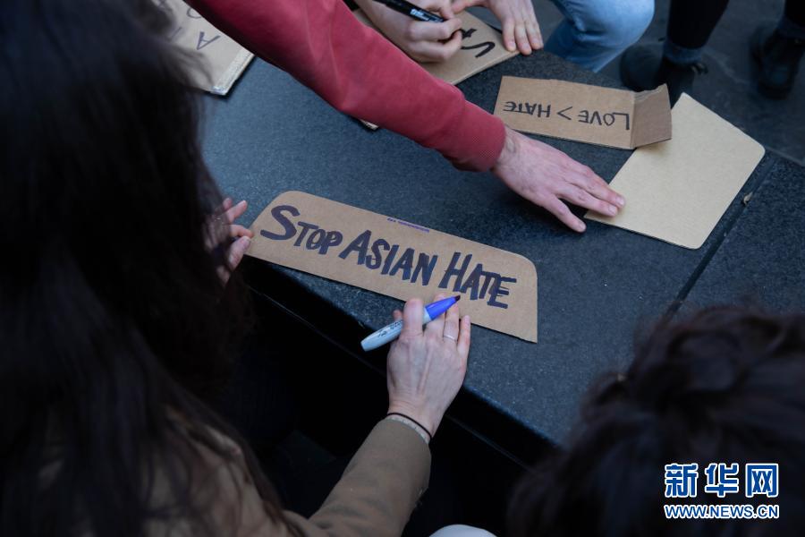 3月20日,民众在美国纽约参加集会时手写标语,抗议针对亚裔的歧视行为和仇恨犯罪。新华社发(迈克尔·内格尔)