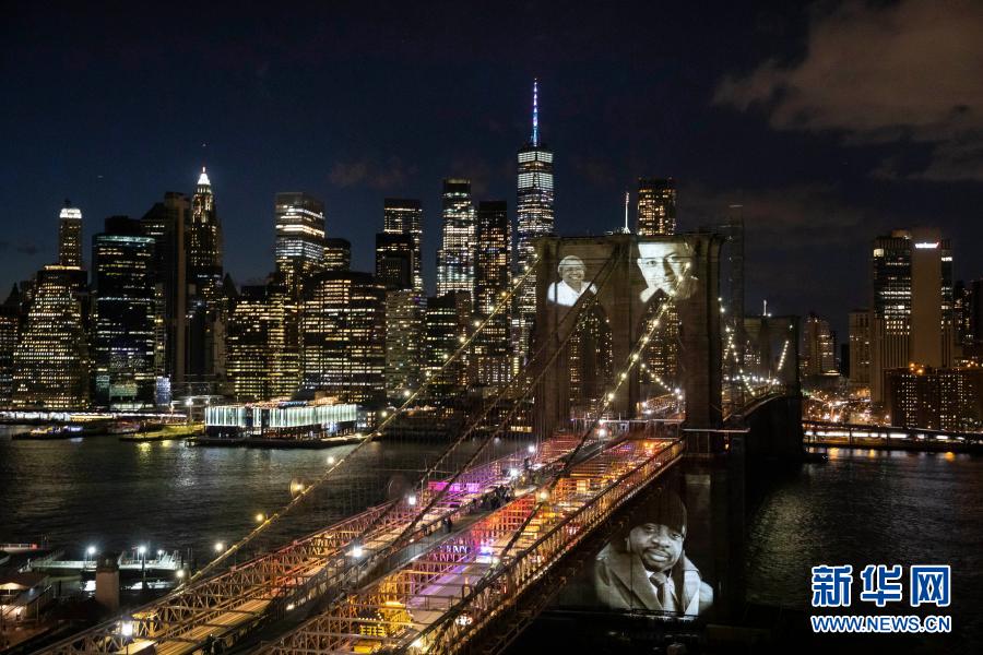3月14日,新冠逝者的照片在纪念活动上被投射到美国纽约布鲁克林大桥上。