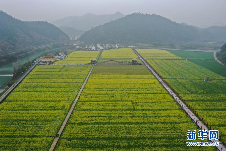 桐庐县分水镇大路村千亩油菜花基地的美丽春色(无人机照片,3月21日摄)。 新华社记者 徐昱 摄