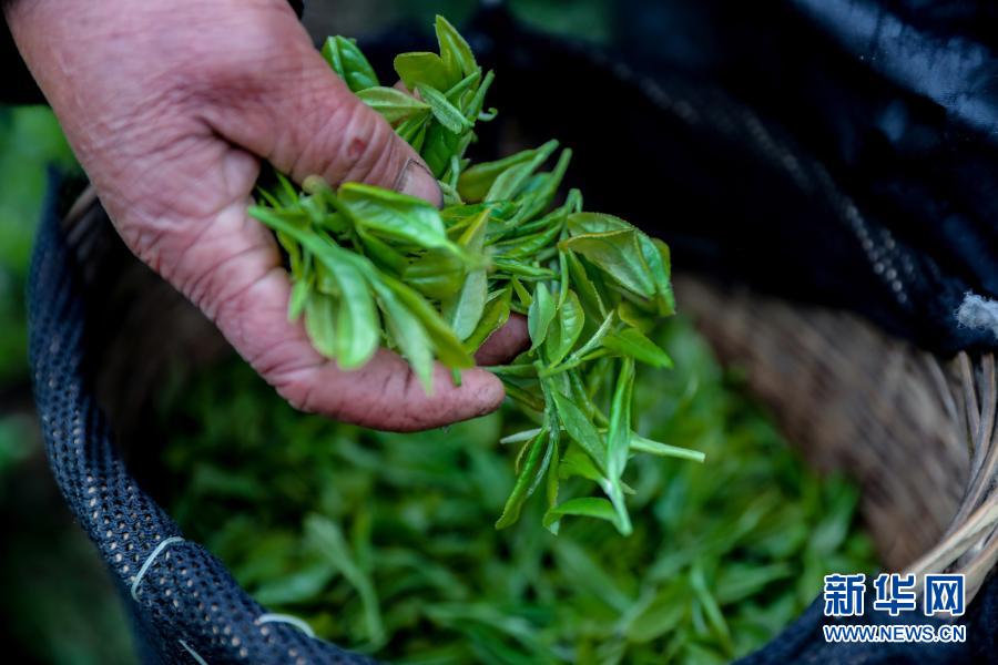 3月21日,茶农在“扶贫茶园”内将采摘的茶青放进竹篓。