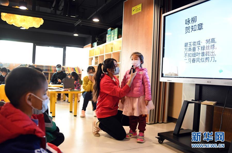 3月21日,在北京外研书店东升科技园店,一名小朋友(右一)在活动中背诵古诗。