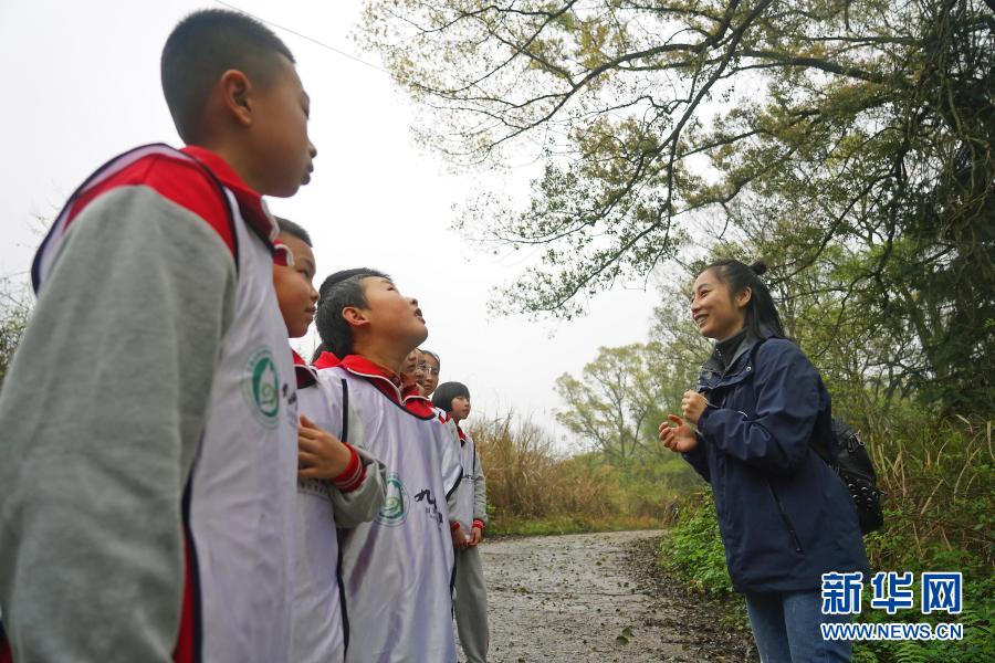 在九岭山国家级自然保护区,邹鸿堰(右一)给孩子上自然体验课(3月18日摄)。新华社记者 万象 摄