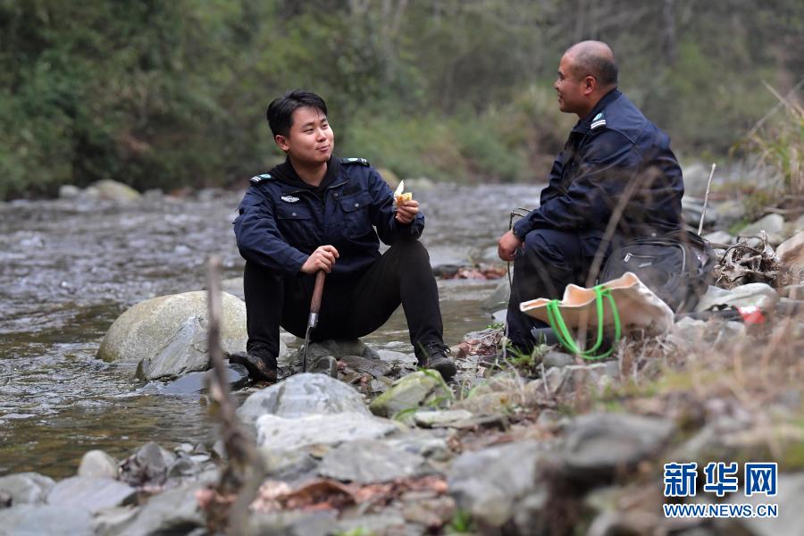 在巡护途中,汤勇(左)和同事在溪流边休息吃干粮(3月17日摄)。新华社记者 彭昭之 摄