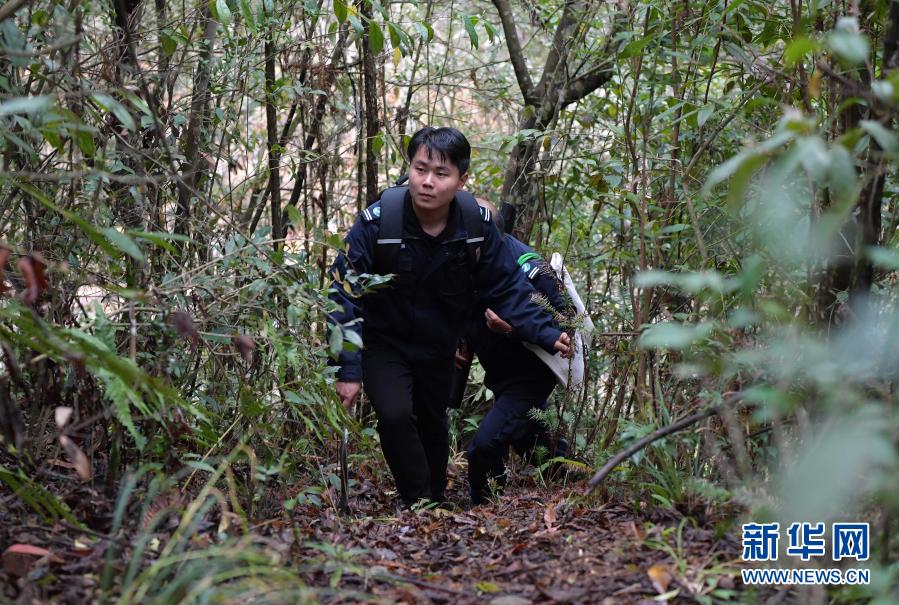 汤勇(前)和同事在巡护途中(3月17日摄)。新华社记者 彭昭之 摄
