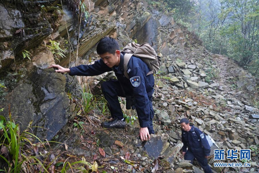 陈亮亮(左)和护林员攀爬巡护线路中的一处陡坡(3月17日摄)。新华社记者 万象 摄