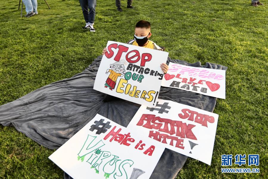 3月20日,一名男孩手持标语参加美国加利福尼亚州洛杉矶县阿尔汉布拉市举行的“停止仇恨亚裔”烛光仪式,抗议针对亚裔的暴力和仇恨犯罪。