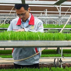 3月21日,在江西省南昌市安义县绿能农民专业合作社的育秧工厂内,工人在查看水稻秧苗长势。
