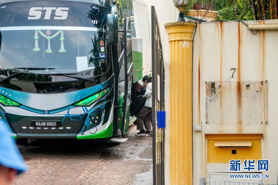 3月21日,工作人员在位于马来西亚吉隆坡的朝鲜驻马来西亚使馆往大巴车上搬运行李。
