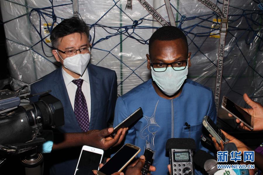 3月21日,贝宁卫生部长洪帕廷(右)在科托努国际机场接受媒体采访。新华社发(塞拉芬摄)