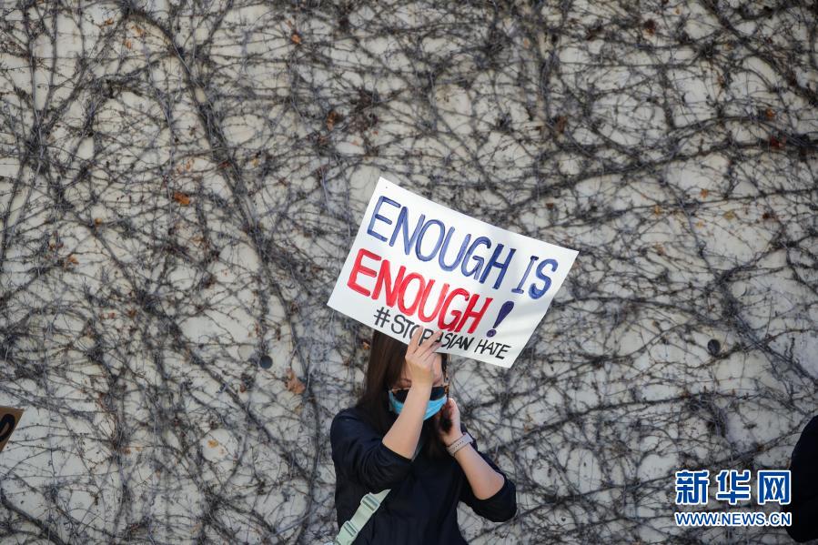 3月21日,一名示威者在美国加利福尼亚州旧金山湾区城市圣何塞参加集会,抗议针对亚裔的歧视行为和仇恨犯罪。新华社发(董旭东摄)