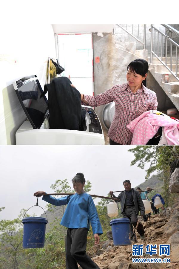 拼版照片:上图为广西那坡县龙合乡明浪村弄蓬屯村民周氏涛将衣物放进洗衣机(3月10日摄);下图为2010年3月29日,取水归来的周氏涛(左一)挑着水和其他村民一起行走在山间小路上。自来水进家庭,让昔日用水不便的群众有条件添置了不少新电器。新华社记者 周华 摄