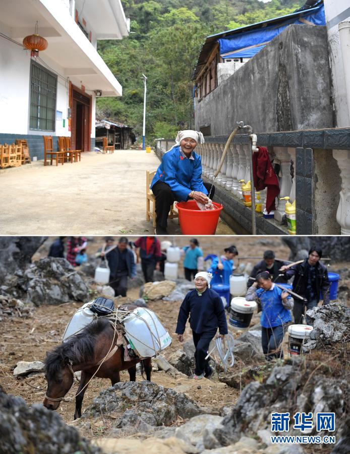 拼版照片:上图为广西那坡县龙合乡明浪村弄蓬屯村民韦秀海用自来水洗衣服(3月10日摄);下图为2010年3月29日,韦秀海(前左一)赶着马和其他村民一起行走在取水的山间小路上。新华社记者 周华 摄
