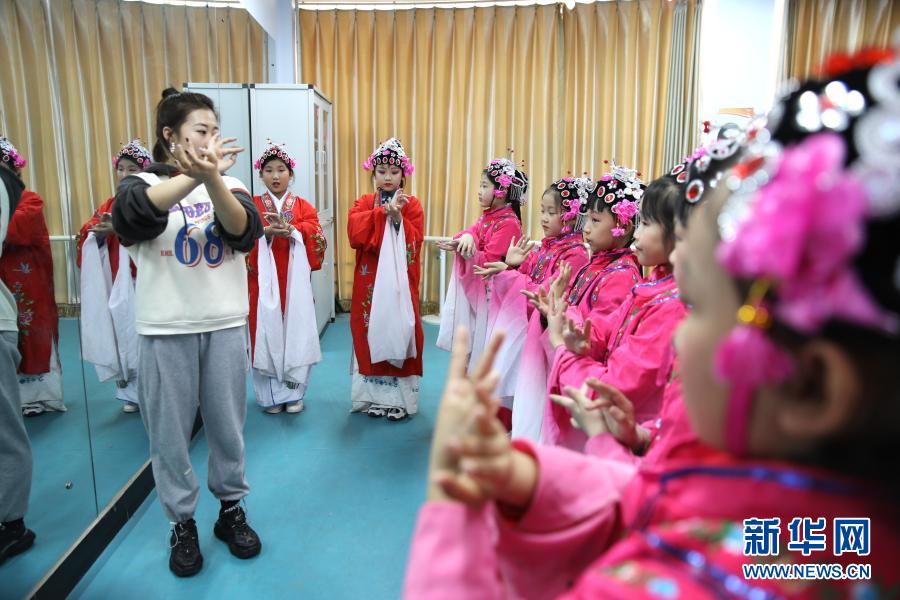 3月22日,在承德县第四小学京剧课堂,学生在老师的指导下进行形体训练。