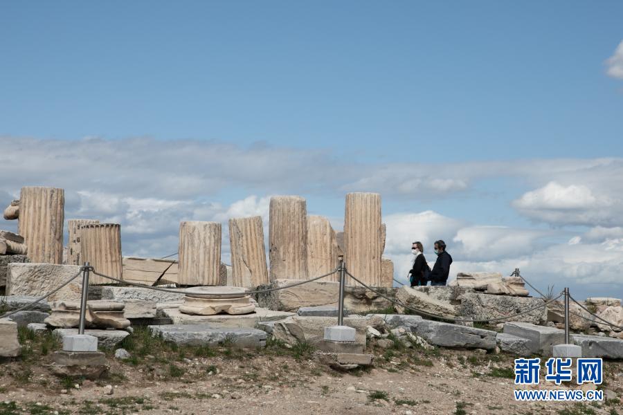 3月22日,游客游览希腊雅典卫城。希腊露天考古遗迹22日起恢复开放。游客需遵守保持社交距离和佩戴口罩等防疫规定。新华社发(莱夫特里斯·帕察里斯摄)