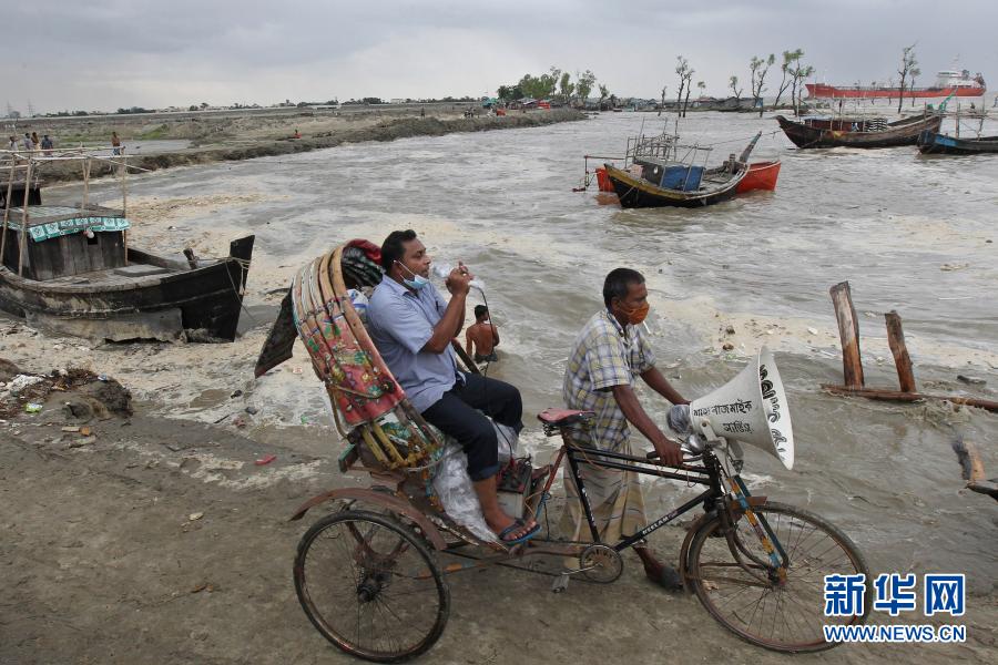 2020年5月20日,在孟加拉国吉大港,工作人员使用扩音器向民众传达特强气旋风暴“安攀”来袭的消息。