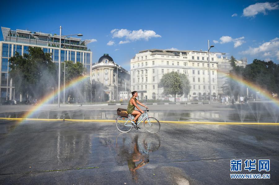 2020年7月28日,一名女子骑车经过奥地利维也纳的喷水降温设施。