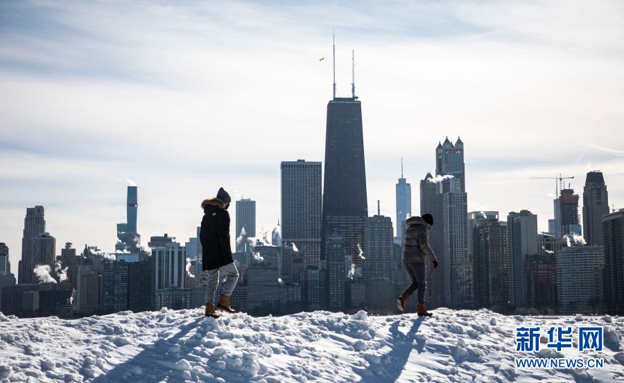 2021年2月7日,人们走过美国芝加哥的积雪。当日,寒潮侵袭芝加哥地区,风寒指数达零下20摄氏度至零下25摄氏度。