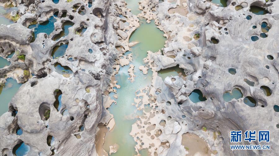 这是2019年7月16日在泰国乌汶府拍摄的三千洞景点。位于湄公河畔的三千洞景点在雨季通常会被河水淹没,但是由于严重干旱导致水位下降,游客仍然可以参观。