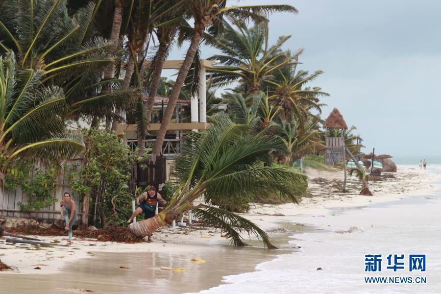 2020年10月7日,在墨西哥金塔纳罗奥州莫雷洛斯港,人们在飓风过后来到海边。