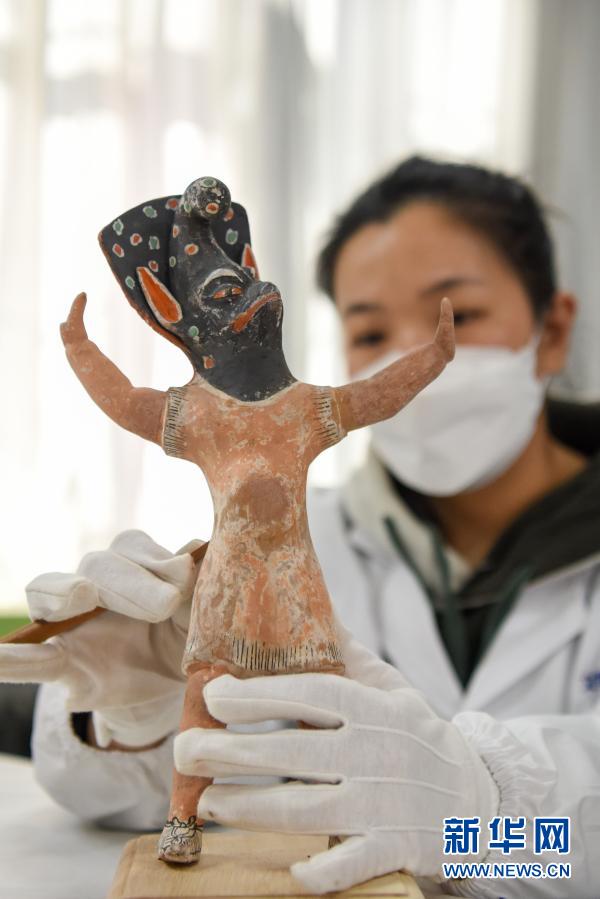 在新疆博物馆文物科技保护中心,工作人员对彩绘戴面具舞蹈泥俑的颜料层进行加固(3月19日摄)。