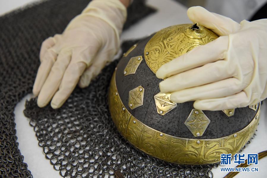 在新疆博物馆文物科技保护中心,工作人员整理修复完成的铁锁子甲衣(3月19日摄)。新华社记者 丁磊 摄