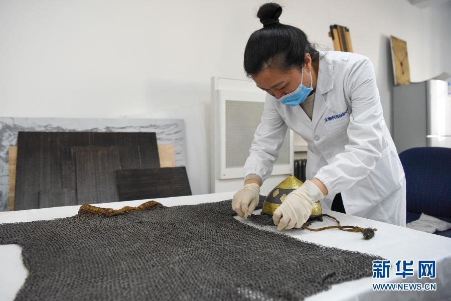 在新疆博物馆文物科技保护中心,工作人员整理修复完成的铁锁子甲衣(3月19日摄)。新华社记者 丁磊 摄