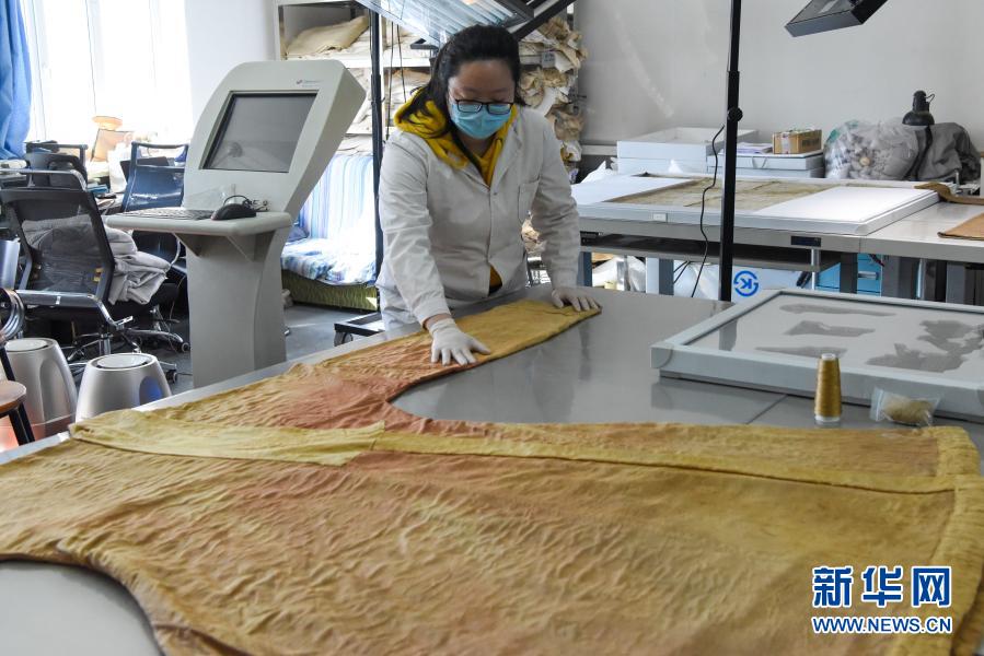 在新疆博物馆文物科技保护中心,工作人员整理修复完成的锦缘绢袍(3月19日摄)。新华社记者 丁磊 摄