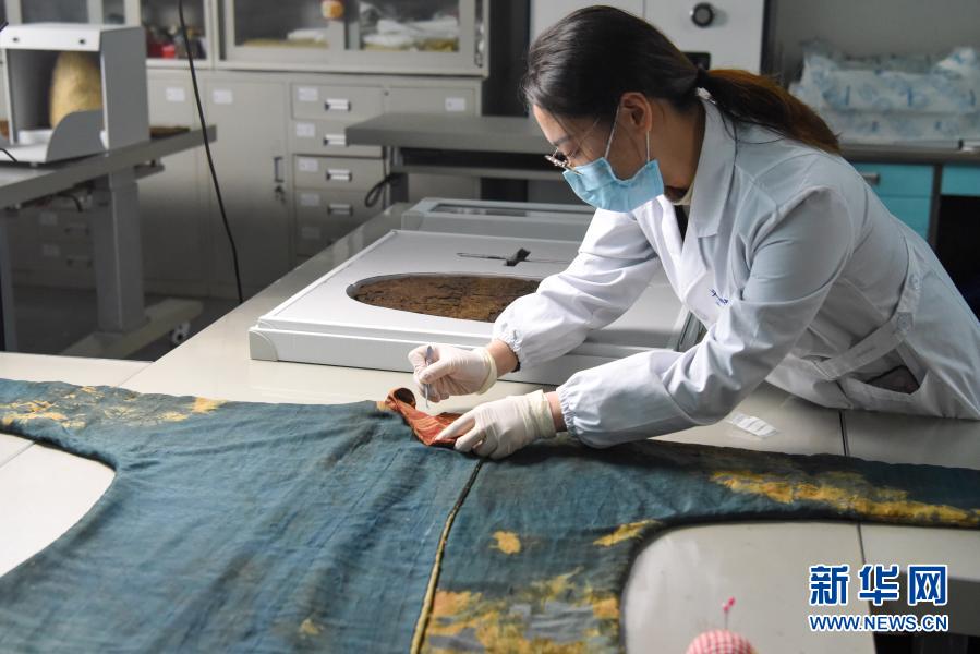在新疆博物馆文物科技保护中心,工作人员在修复宝花凤纹锦袖暗花绮袍(3月19日摄)。新华社记者 丁磊 摄