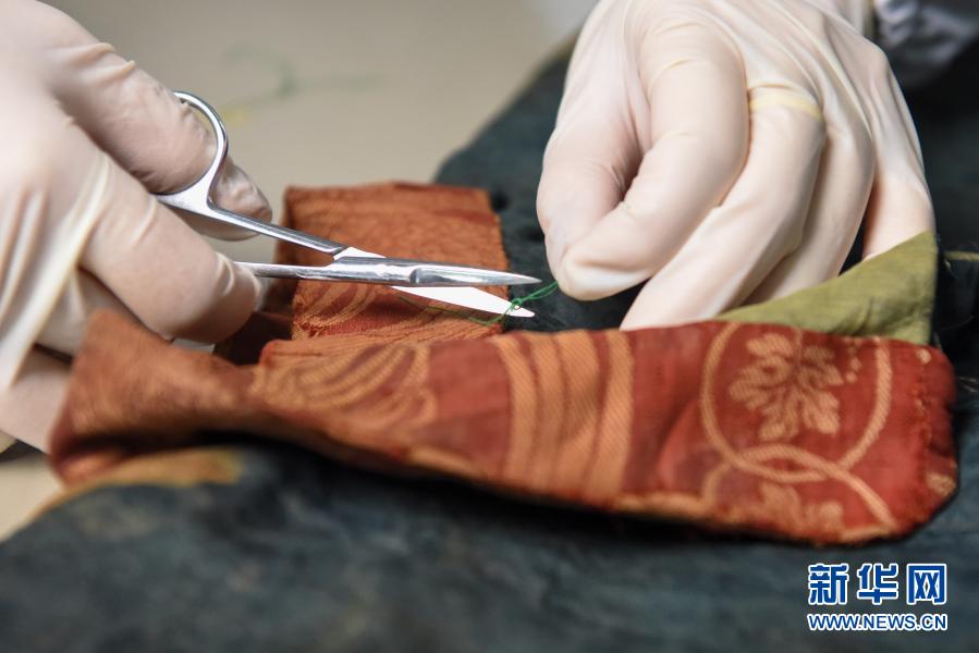 在新疆博物馆文物科技保护中心,工作人员在修复宝花凤纹锦袖暗花绮袍(3月19日摄)。新华社记者 丁磊 摄